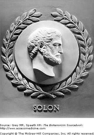 Biological warfare has long been a part of the history of humanity. In fact, it is thought that the use of poisonous agents predated recorded history, though the crude use of biological weapons is first documented in written and visual form as early as 600 bc. That year, the Athenian General Solon contaminated the water supply of the besieged Greek city of Cirrha with black hellebore root. Crippled by severe diarrhea, the Cirrhaeans were defeated easily. Some two hundred years later, in about 400 bc, Scythian archers used arrowheads dipped in animal feces, blood, and decomposed carcasses to combat their opponents (Fig. 10–1). Interestingly, there is a long historical and prehistorical association between arrows and poison as dipping arrowheads in poison was the typical means for delivering poisonous substances. In both Greek and Latin, the derivation on the word toxin is related to arrow. The great Carthaginian general, Hannibal (247–182 bc), led his troops to victory over the King Eumenes of Perganum in part by hurling clay pots filled with snakes onto the decks of the Greek armada. Hannibal also used plants containing a belladonna-like chemical to incapacitate his enemies (see Chapter 21).