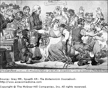 Both plague and smallpox have been used effectively to sow terror and death. During the Middle Ages, attacking armies sometimes catapulted the corpses of plague victims into besieged cities. In 1346, for example, the city of Kaffa became pestilent following a Tartar attack using this early form of biological warfare. During the French and Indian Wars in colonial America, Lord Jeffrey Amherst ordered that smallpox-contaminated blankets be sent to Native American tribes allied with the French. This type of practice became so common and so effective a military tactic that during the Revolutionary War, General Washington ordered variolation of the entire Continental army. Variolation required immunization with live vaccines taken from lesions of smallpox victims. Although effective, variolation also caused disease at a rate of about one for every 2,000 immunized individuals (Fig. 10–2).
