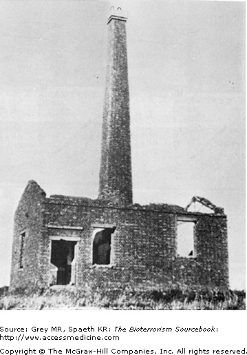 During World War II (WWII), improved scientific understanding of microbes and microbiology spurred the creation of even more efficacious biological weapons. The Japanese military engaged in an aggressive biological weapons program from the 1930s to the end of WWII. Unit 731 (Fig. 10–3), as the notorious program was known, employed over 3,000 scientists and technicians at its peak. Japanese airplanes dropped plague-infected rice and fleas across mainland China on at least 11 different occasions as part of its effort to conquer that nation. During the war, Unit 731 conducted inhumane experiments on Chinese, Korean, Mongolian, Soviet, American, British, and Australian prisoners of war. The prisoners are known to have been experimented on with biological weapons such as anthrax, botulism, brucellosis, cholera, dysentery, gas gangrene, meningococcal infection, and plague. All told, over 1,000 prisoners were killed during these experiments, as documented during the war tribunals of the mid- and late 1940s. Japan was by no means alone in their efforts to develop bioweapons; nearly every major industrial power was attempting to develop such weapons. Fearing Germany’s use of aerial anthrax, England tested its own version on sheep herds on several islands off the coast of Scotland. Later, they stated the intended use of such a bomb was as a retaliatory measure only.