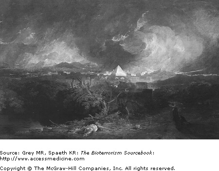 Since antiquity, anthrax has affected livestock and humans. The name anthrax derives from the Greek word for “coal” because of the black skin lesions it can cause. One of the first records of anthrax is in the Old Testament’s Book of Exodus as the fifth and possibly sixth of the ten plagues (Fig. 14–1). Virgil wrote verses on the disease in 25 bc describing the toll it took on livestock and the health risks to humans from exposure to infected meats and skins. The modern history of anthrax begins in the late nineteenth century when Louis Pasteur identified the bacterium responsible for anthrax, an observation that lent early credibility to the germ theory of disease. Anthrax was used as a weapon in World War I as a means to cause economic havoc through the loss of livestock.