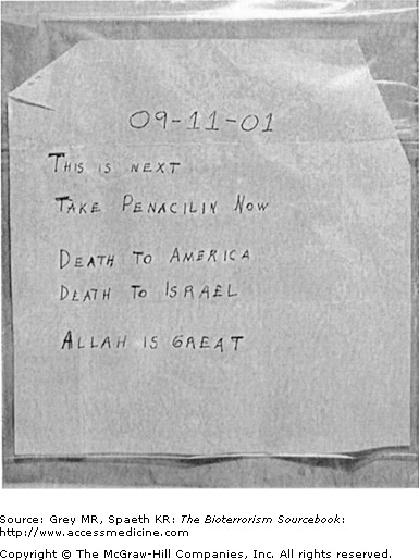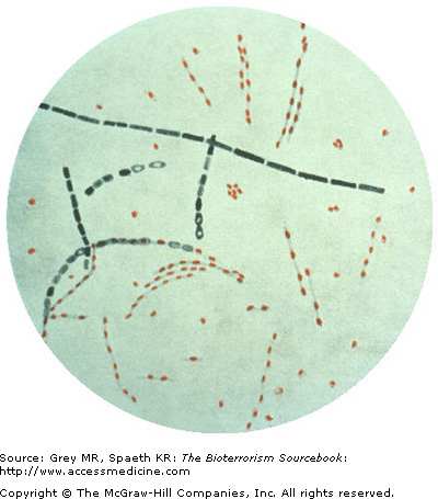 Infection occurs from direct contact with active bacteria or indirectly from contact with spores that then germinate. The spores may be in animal hair, meat, hides, or other products. The weaponized form of anthrax is constituted as spores less than five microns in size and may be maintained as powder or aerosolized. Prior to the U.S. Postal Service attacks, the LD50 (see Glossary) for anthrax was thought to be between 2,500 and 55,000 inhaled spores. Weaponized anthrax is far more potent with inhalation of as few as several hundred spores sufficient to cause disease. Estimates from the U.S. Postal Service attacks suggest that the LD50 as well may have been an order or two below naturally occurring anthrax (Fig. 14–3, Table 14–1).