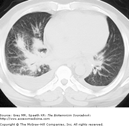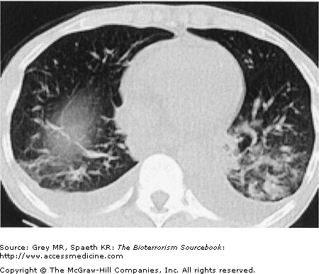 Inhalational anthrax is characterized by a series of radiographic and tomographic changes that can aid greatly in diagnosis. Radiographs provide critical diagnostic information many hours or even days before blood or sputum cultures can turn positive. These changes, when presenting late, indicate a poor prognosis. Computed tomography (CT) taken of the post-September 11 anthrax patients also showed characteristic abnormalities that have substantial diagnostic value. Initial CTs in virtually all of the post-September 11 inhalational anthrax cases were markedly abnormal and had an unusual combination of findings of enlarged hyperattenuating mediastinal and hilar lymph nodes, diffuse mediastinal fat edema, peribronchial thickening, and pleural effusions. Given the rarity of inhalational anthrax in the modern era, this terrorist attack provided valuable information for the presentation of anthrax in the era of CT scans. The findings corroborate the classic chest radiograph findings. CT scans are now considered a standard diagnostic tool for inhalational anthrax. These key radiographic findings are summarized in Table 14–2 (see also Figs. 14–5, 14–6, 14–7, and 14–8).