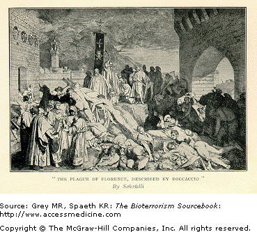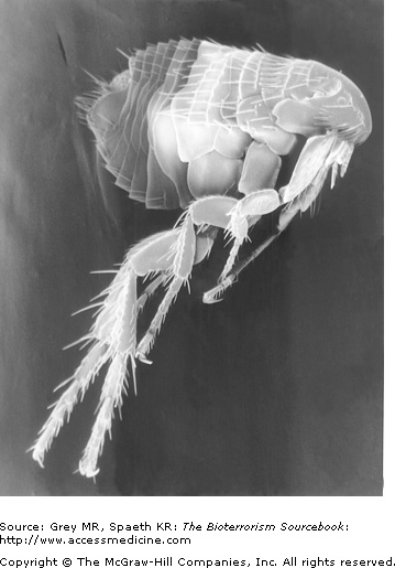 Naturally occurring plague transmits to humans from bites of infected fleas that typically derived their infection through having bitten infected rodents (Fig. 15–5). Generally, such transmission results in the bubonic form of the plague. A small percentage of those bitten, however, will develop a septicemic form referred to as primary septicemic plague. It is important to note that neither of these two forms are transmitted from one human to another. Those infected with a pneumonic form, in contrast, can spread the disease through aerosolized droplets. In a biological attack, the most likely means of transmission would be through aerosolization of plague bacilli. Consequently, the clinical scenario would be the opposite of that seen with naturally occurring plague. That is, the pneumonic form would dominate and mortality would be far higher than with naturally-occurring plague. The success of such an attack would still be influenced by a number of variables, including climatic conditions, or the amount and type of Y. pestis strain used. It is possible for a biological attack to come in the form of deliberate infection of a natural animal reservoir in a major city. However, experts believe this is an inefficient means of initiating a plague epidemic.