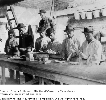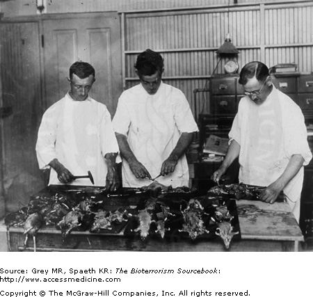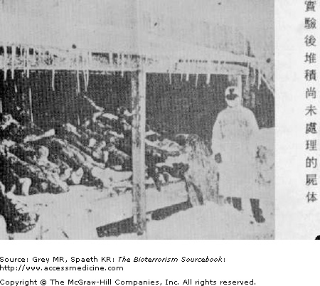 As Japan’s use of plague in China during WWII demonstrated, the effective use of plague as a bioweapon requires little sophistication and can have dramatic effects (Fig. 15–4). Most countries engaged in biological weapons research and development programs aim to use aerosolized Yersinia, eliminating the need for the rat host or flea vector and enhancing transmissibility and virulence. In 1970, the WHO estimated that 50 kg (110 lb) of Y. pestis sprayed over a city would infect 150,000 people and kill roughly 40,000. Both North Korea and Iraq are believed to have been engaged in weaponization of plague. The former Soviet Union’s Biopreparat conducted massive research on weaponized plague and large quantities were stockpiled. It is sobering to acknowledge that many scientists involved in this research, and the stores themselves, remain largely unaccounted for at present.