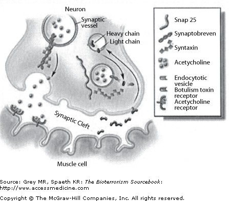 All three naturally occurring forms of botulism toxin (foodborne, wound, and intestinal) result from Clostridium synthesis of botulinum either in vivo or prior to entering the bloodstream. Botulinum enters the body via absorption through the mucosal linings of the gastrointestinal or respiratory tracts, or from a contaminated wound site. Importantly, botulinum cannot enter the body through intact skin. A bioterrorist attack with botulinum would likely be from an aerosolized form, although it is possible that it could occur through contamination of food or water. Some protection is offered by simply covering one’s mouth with thick or folded cloths such as a handkerchief. Fortunately, sunlight denatures the toxin rendering it harmless within one to three hours of exposure, and the chlorine content of most municipal water supplies inactivates approximately 85% of botulinum toxin. Foodborne outbreaks, natural or deliberate, require foods that are uncooked or are poorly cooked. Natural infections tend to occur from contaminated vegetables—particularly those with a relatively high pH, such as beans, corn, carrots, and peppers. Life support systems and botulinum antitoxin have decreased the mortality rate to less than 5%.