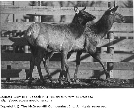 One of the world’s most significant agents of animal disease, Brucella species are found naturally in a wide range of animal reservoirs including livestock, farm animals, and dogs. Brucellosis—also known as undulant fever due to its characteristic biphasic fever curve—is caused by a number of different species within the genus. Four of those are known to be infectious to humans. Because it is both an animal and a human disease, Brucella species can be wielded to inflict both human health and economic injuries. As an agent of bioterror it would most likely be used in aerosol form.