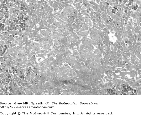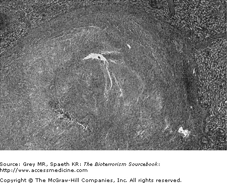 There are three acute forms of glanders: focal, pulmonary, and septic. They may occur in isolation or in combination. A chronic form of the disease, known as “farcy,” presents with lymphangitis and lymphadenopathy. The focal form is seen following exposure through an epidermal break and direct bacterial contact after an incubation period of about five days. Following implantation, a nodular lesion with local lymphangitis and lymphadenopathy results. Similarly, infection of an upper respiratory site or ocular infection causes a pustular, ulcerative lesion. In the former instance, production of bloody and/or purulent sputum results. If systemic seeding occurs from these sites, abscesses in a variety of organs (or a diffuse maculopapular rash that may mimic smallpox) may arise. The pulmonary form of glanders occurs after inhalation of the bacterium or as a result of hematogenous spread from a focal infection. The incubation period in the respiratory tract is up to fourteen days. Clinical manifestations include fever, myalgias, headache, and pleuritic chest pain. The septicemic form of glanders can occur as a primary infection, or it may result from hematogenous spread from pulmonary or focal infections. Symptoms include flu-like features such as fever, myalgias, cervical adenopathy, and diarrhea, as well as cutaneous findings such as necrotizing, pustular lesions, generalized erythroderma, and jaundice. CNS findings of septicemic glanders include headache and photophobia. This form of the disease is distinctly uncommon but carries with it a high mortality rate with death occurring within 2 weeks of onset.