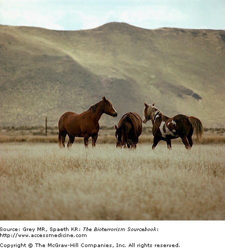 Glanders is a disease primarily affecting members of the equid family, including horses, mules, and donkeys. Other animals—humans included—are also susceptible to the disease. Human cases of glanders occur sporadically. In all likelihood, glanders has been used as a biological weapon for nearly a century. In World War I, the German army was suspected of having intentionally infected a large number of horses of the Russian army along the eastern front with this zoonotic disease. The Japanese infected horses, civilians, and prisoners of war with glanders (and other biological warfare agents) during its occupation of China. During World War II, unconfirmed reports suggest that the Soviet army used glanders during its occupation of Afghanistan in the 1980s. Excepting the biowarfare examples noted, there are no documented naturally occurring epidemics of the disease. As a biological weapon, aerosolized glanders represents the most concerning possibility.