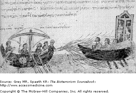 The crude use of chemical weapons is documented in written and visual form as early as 600 BC. That year, the Athenian general Solon contaminated the water supply of the besieged Greek city of Cirrha with black hellebore root. Crippled by severe diarrhea, the Cirrhaeans were defeated. This may have been the first known use of incapacitating agents as chemical weapons. During the Peloponnesian War (420 BC), Spartan forces overran an Athenian stronghold by using irritating fumes created by the burning of sulfur, coals, and tars. Nearly a millennium later, this practice evolved into a common military tactic referred to as “Greek fire,” the formula that has forever been a secret, but is thought to be a precursor to napalm involving burning a mix of sulfur, resin, pitch, naphtha, lime, and saltpeter. Greek fire was used in large scale first by the Byzantines in naval wartime. They would place the materials in bronze tubes, ignite the materials, and direct the flame through the tube at enemy fleets.