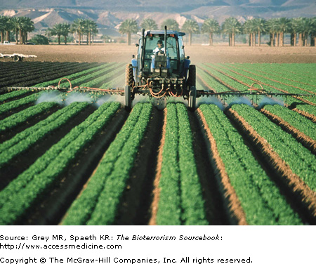 There are two primary means of exposure. The G agents are vapors under most conditions and so are inhaled or absorbed through the conjunctiva, whereas the V agents are liquids and are absorbed through the skin. Ingestion is a possible but unlikely route of exposure. Inhalational exposure is most likely to occur when nerve agents are released in an aerosolized form or if sprayed (Fig. 25–3), such as from a helicopter or crop duster. Systemic absorption occurs within minutes. The rapidity with which clinical effects occur is dose and time dependent. In general, vapor exposure elicits symptoms immediately or within minutes, with peaks occuring within a few minutes after exposure. Vapor can also be absorbed through the eyes concurrent to respiratory absorption. Percutaneous exposure occurs when liquid forms of the nerve agents come into contact with the skin, eyes, mouth, or membranes of the nose (Fig. 25–4).