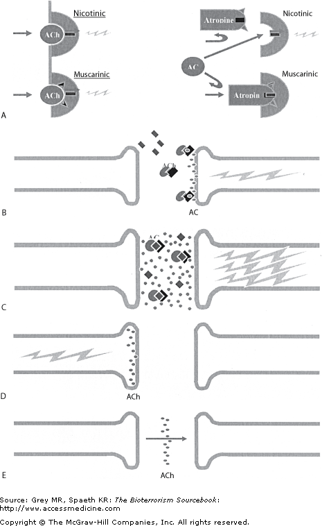 Nerve agents’ physiologic and clinical effects mirror those of the organophosphate family of pesticides. They act by irreversibly inactivating esterase enzymes, the most clinically relevant one being acetylcholinesterase (AChE). AChE acts in the synaptic cleft throughout the peripheral nervous system, as well as in the autonomic nervous system and central nervous system (CNS). Its function is to degrade the neurotransmitter acetylcholine (ACh). Nerve agents bind covalently to AChE within seconds or minutes, causing structural changes that render the enzyme useless. After the formation of the covalent bond, an isopropyl (alkyl) group detaches from the enzyme as part of a process referred to as “aging.” Once aging occurs, the enzyme is irreversibly impaired. The loss of enzymatic breakdown results in the accumulation of ACh in the synapse and hyperstimulation of muscarinic and nicotinic receptors throughout the body. This hyperactivity, as well as the direct disruption of neurons in the CNS, define the clinical presentation of nerve agents. Although inhibition of AChE is responsible for the clinical syndrome, inhibition of other esterase enzymes is of clinical value in diagnosing exposure to either organophosphates or nerve agents. Specifically, both serum and red blood cell (RBC) cholinesterase levels are useful as markers of exposure to organophosphates and nerve agents.