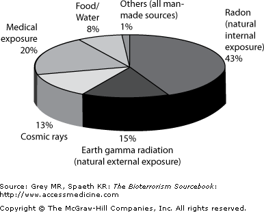 Life on earth evolved in a shower of ionizing radiation. Indeed, evolution as we currently understand it is singularly dependent on ionizing radiation’s capacity to alter genomic sequences and change the structure and function of intracellular proteins. The human body experiences some 1012 collisions daily from ionizing radiation from a wide range of cosmic and earth-bound sources (Fig. 28–1). For obvious reasons, therefore, humans have evolved repair mechanisms and genetic redundancies that enable us to withstand these exposures without obvious effect. Much of the information used to determine the health effects of radiation on humans derives from the atomic bombing of Hiroshima and Nagasaki, as well as industrial, research, and environmental accidents. To better understand the health effects of ionizing radiation, and specifically, the issue of nuclear terror, this section provides a short introduction to radiation terminology and radiation physics.
